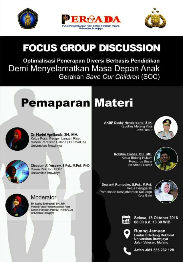 Focus group discussion ini diadakan oleh PERSADA Universitas Brawijaya dan Polres Malang Kota dengan tema “Optimalisasi penerapan diversi berbasis pendidikan demi menyelamatkan masa depan anak”.